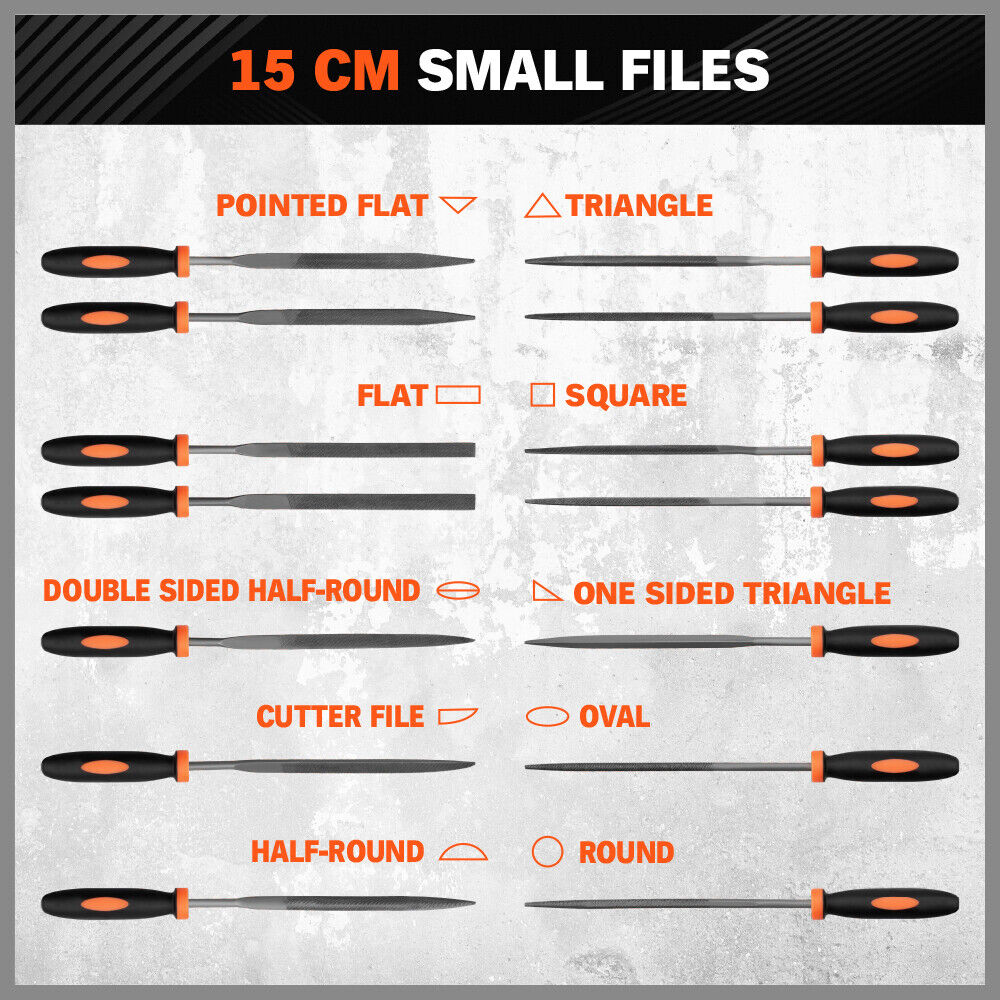 This set includes flat, triangular, round, half-round, and square files, covering a wide range of shaping and smoothing needs for various materials. -