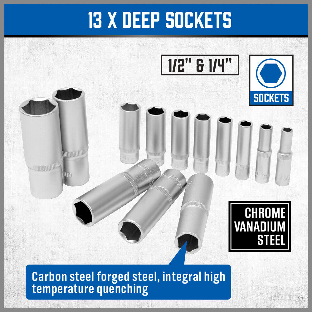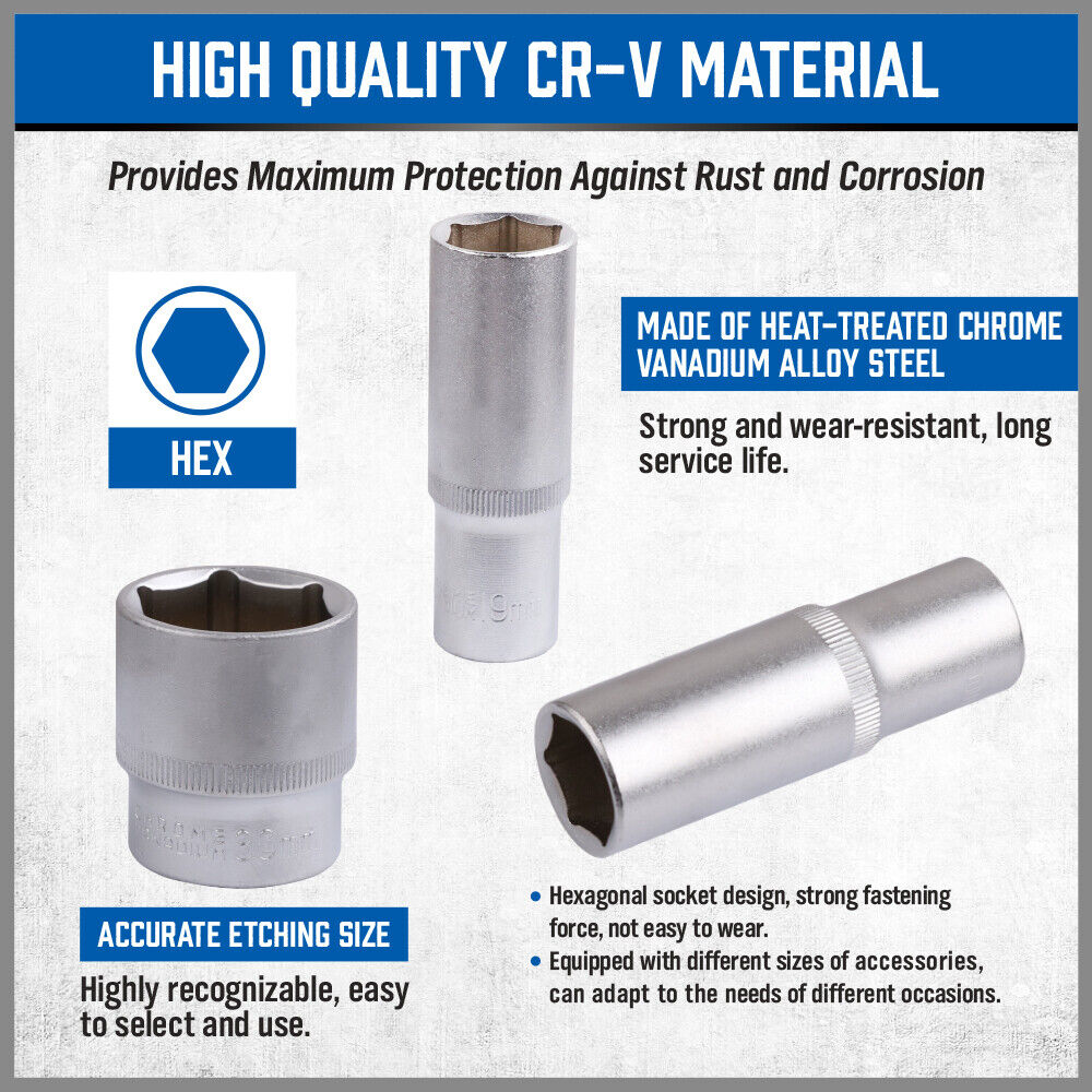 DURABLE CR-V STEEL – Made from heat-treated chrome vanadium alloy steel, this socket set offers exceptional strength, corrosion resistance and long-lasting performance.