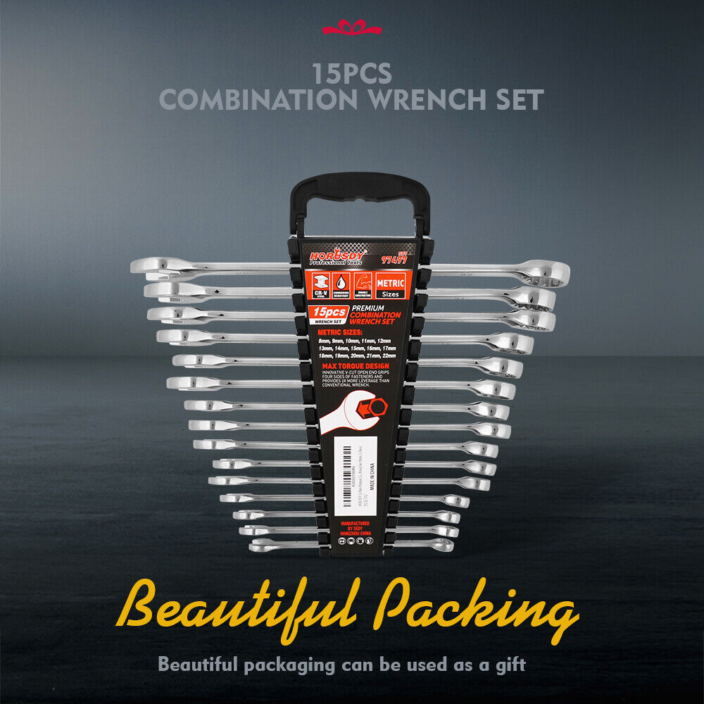 COMPLETE SET – 15-piece metric combination wrench set covering sizes 8mm to 22mm, perfect for workshop repairs, automotive work, and household maintenance.