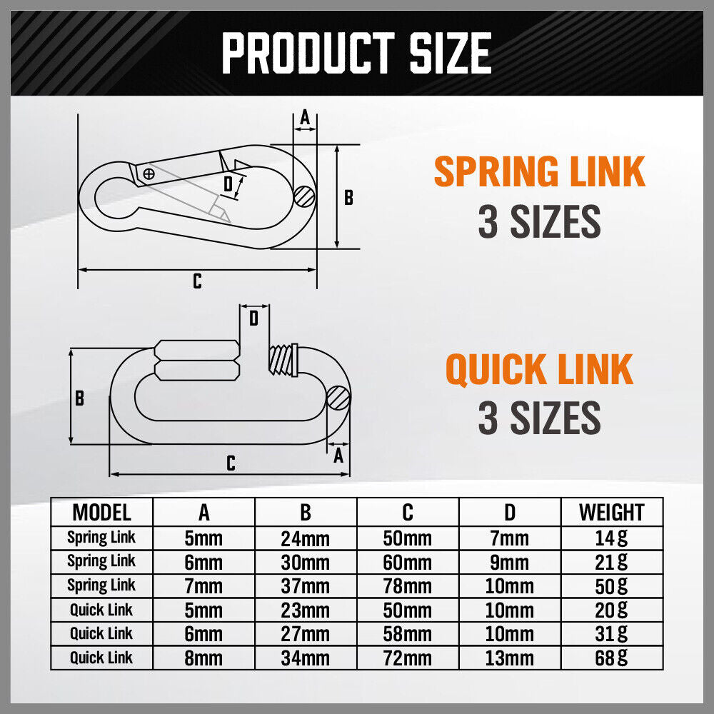 6PCS ASSORTMENT – Includes 3 quick links (5×50mm, 6×60mm, 8×80mm) and 3 snap hooks (5×50mm, 6×60mm, 7×78mm), covering multiple fastening needs.