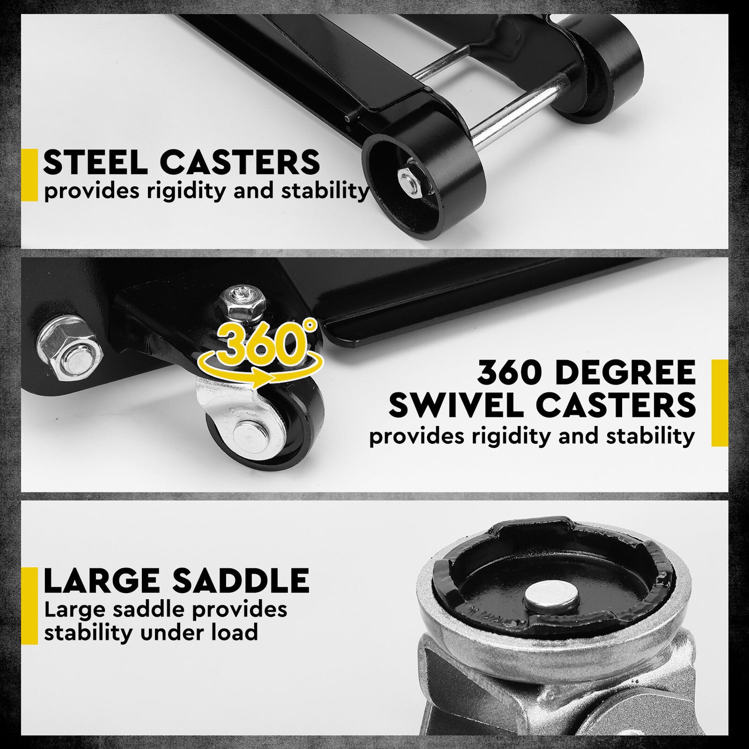 360° Swivel Casters – Dual front steel wheels and rear swivel casters provide easy manoeuvrability and stability during lifting.