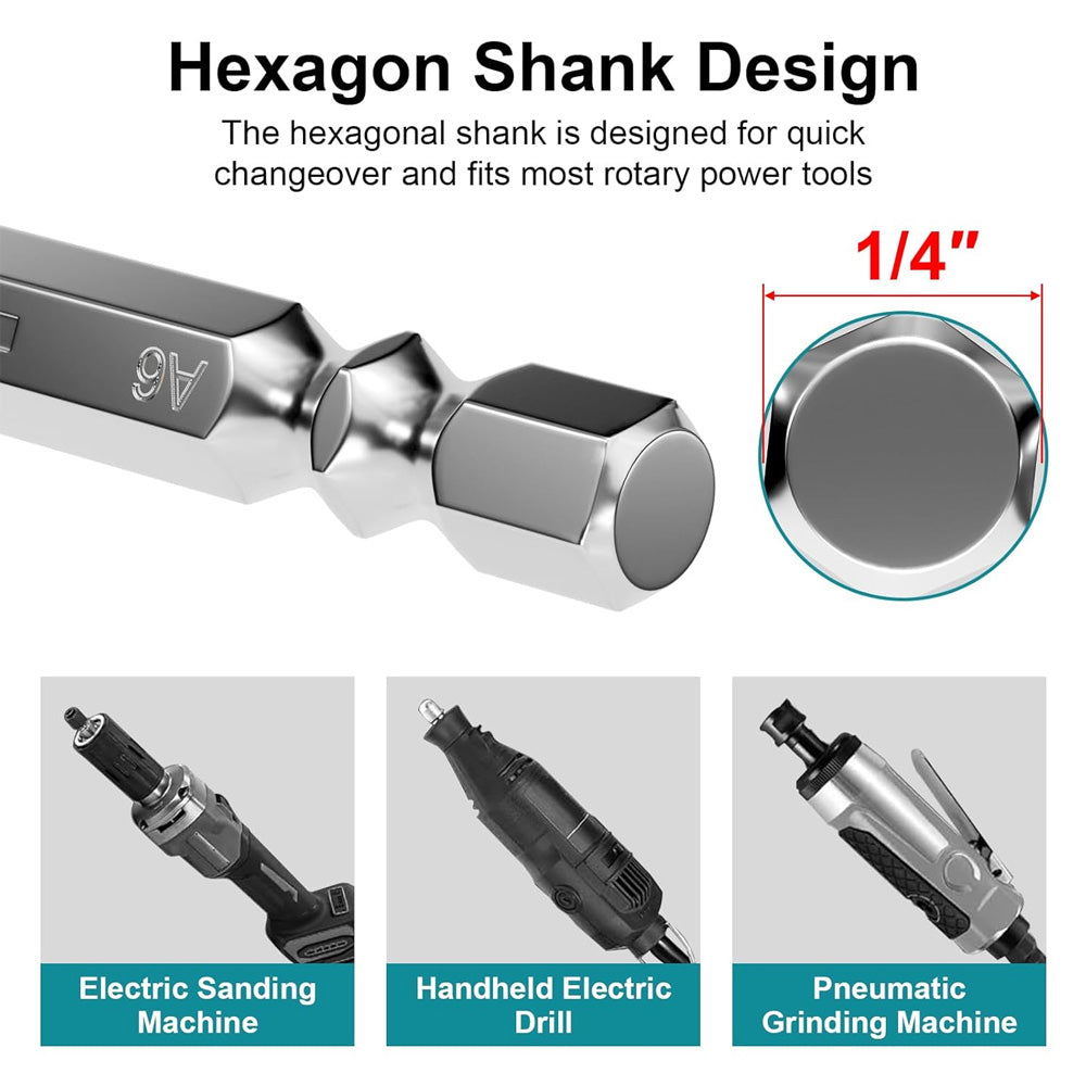 1/4” HEX SHANK DESIGN – Fits most rotary tools, drills, and die grinders. Enables quick bit changes and firm grip without slippage.