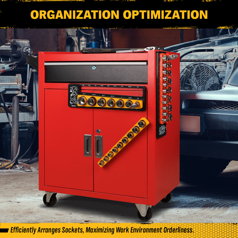 Heavy-duty magnetic backing keeps the socket trays firmly attached to tool carts, metal cabinets, and workbenches without slipping or falling. -