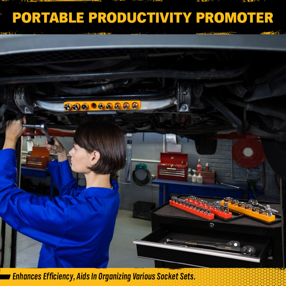 Features 35 precision-marked slots (19 Metric + 16 SAE) for quick socket identification, helping mechanics and DIYers save time and stay organised. -