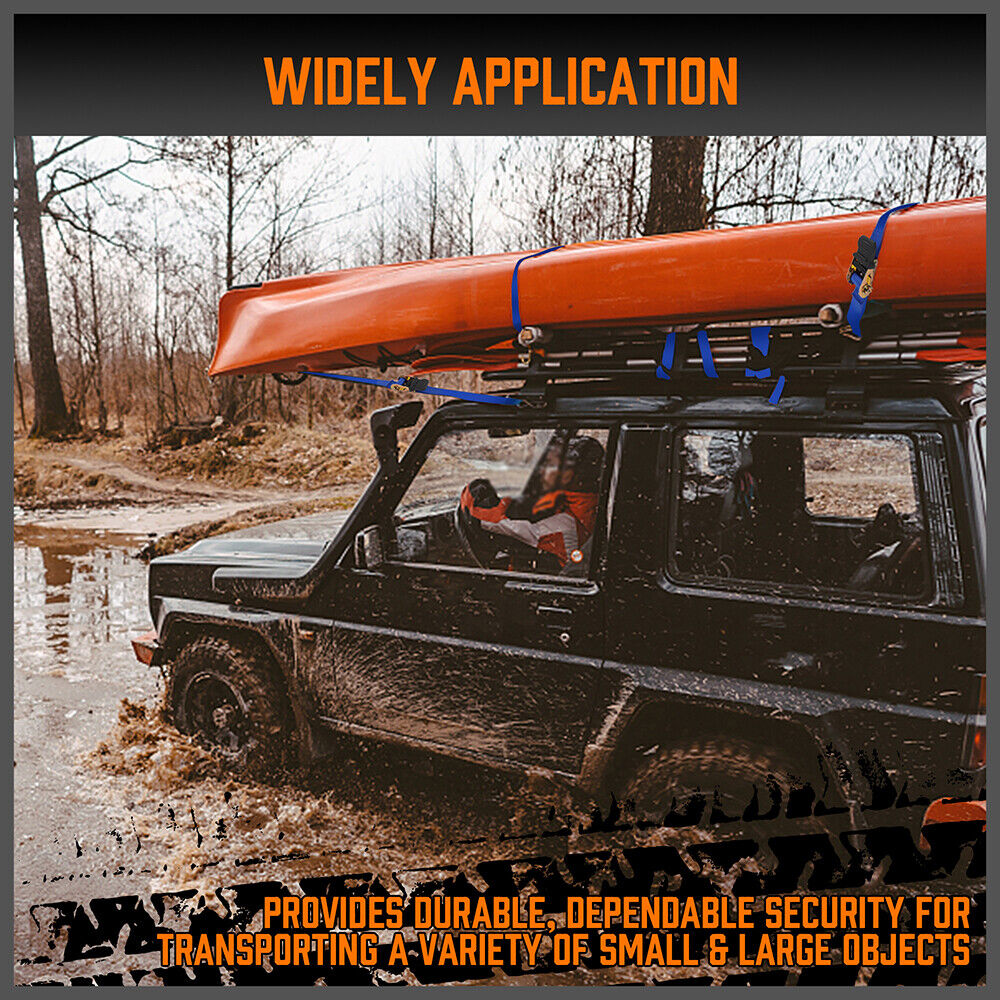 STRONG LOAD CAPACITY – Heavy-duty ratchet tie down straps with a working load limit of 2200lbs, designed to keep motorcycles, kayaks, furniture, or cargo safely secured during transport.