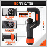 【Easy to Use】Slide the cutting wheel feed mechanism into place, line up the cutting wheel with the cut line and tighten handle, rotate cutter around tube, tighten knob every few turns until wheel cuts through, use reamer to smooth the edges of the cut.