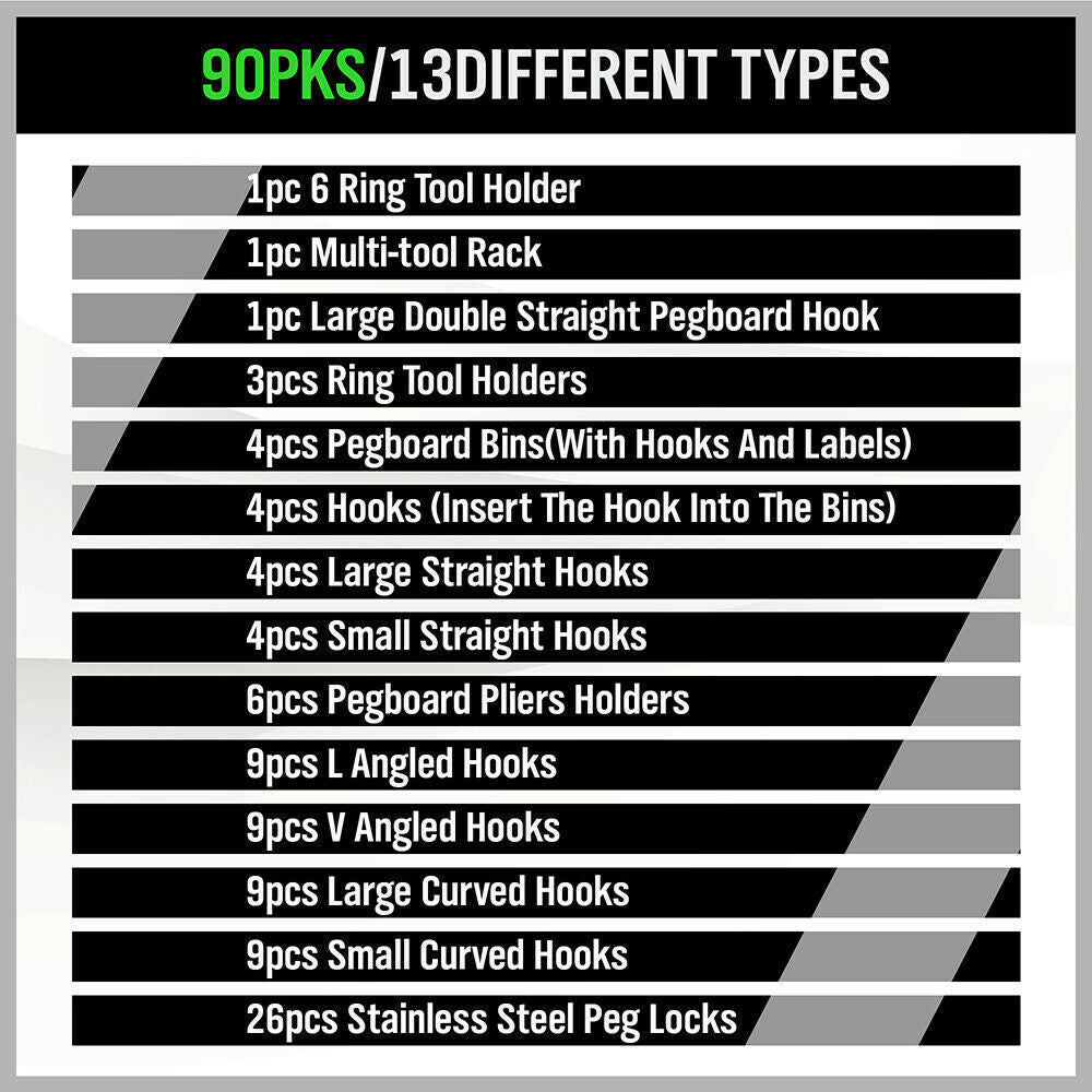 1. COMPLETE 90PCS SET – Includes 13 types of hooks, bins, and holders to organise tools, accessories, and hardware for workshops, garages, or sheds.