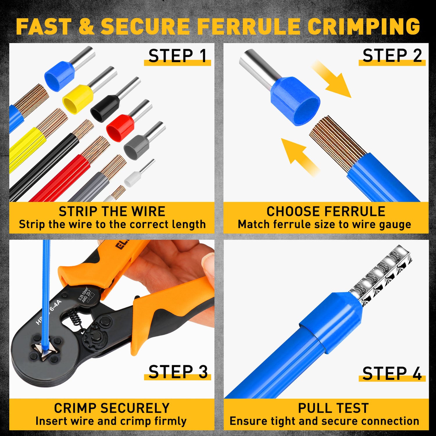 The crimping plier supports AWG 23–7 (0.25–10mm²) wire sizes and delivers precise square crimping for secure electrical connections. Ideal for ferrule terminals used in control panels and electrical equipment.