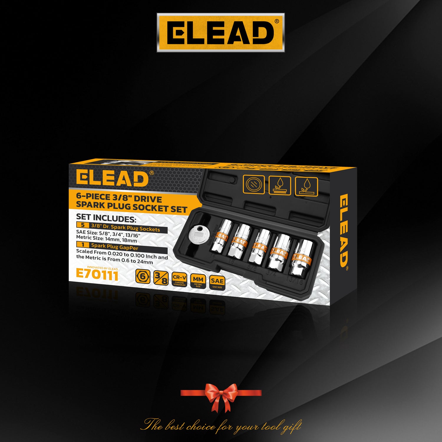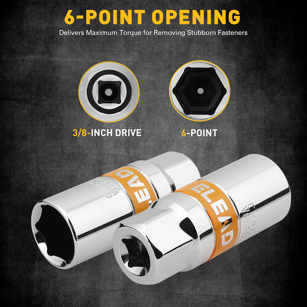 ELEAD 6-Piece 3/8" Drive Spark Plug Socket Set with CR-V Steel, Metric & SAE Sizes, 6-Point Design and Spark Plug Gapper in Storage Case