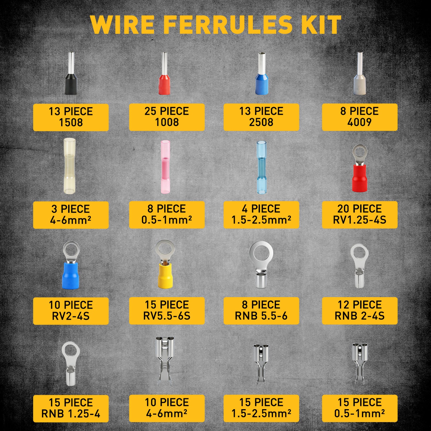 Includes a large assortment of heat shrink terminals, ferrules, ring terminals, plug terminals and bare terminals, making it a versatile wiring solution for professionals and DIY users.
