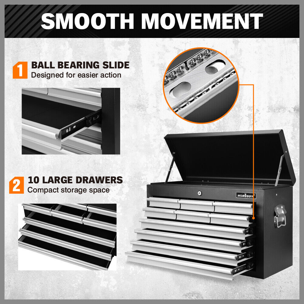 - 10 drawers portable storage tool chest with two comfortable side handles and full-length piano hinge