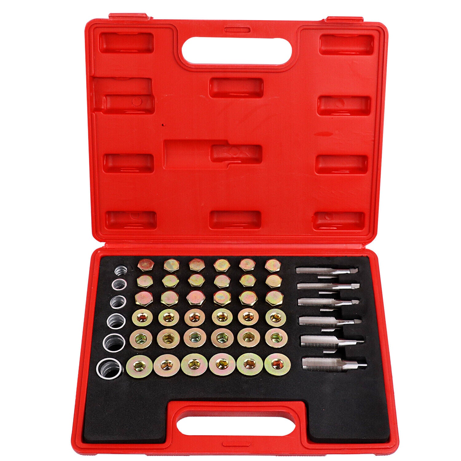 114-PIECE KIT – Complete oil pan thread repair set with taps, screws, and gaskets, designed for professional mechanics and DIY car maintenance.