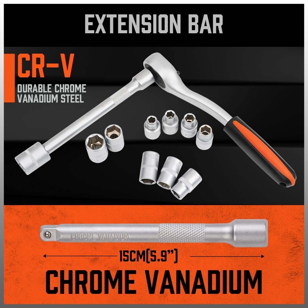 12-PIECE SOCKET SET – Includes 3/8" drive ratchet, 15cm extension bar, and 10 sockets (6–15mm), ideal for car repair, bike maintenance, and household tasks.