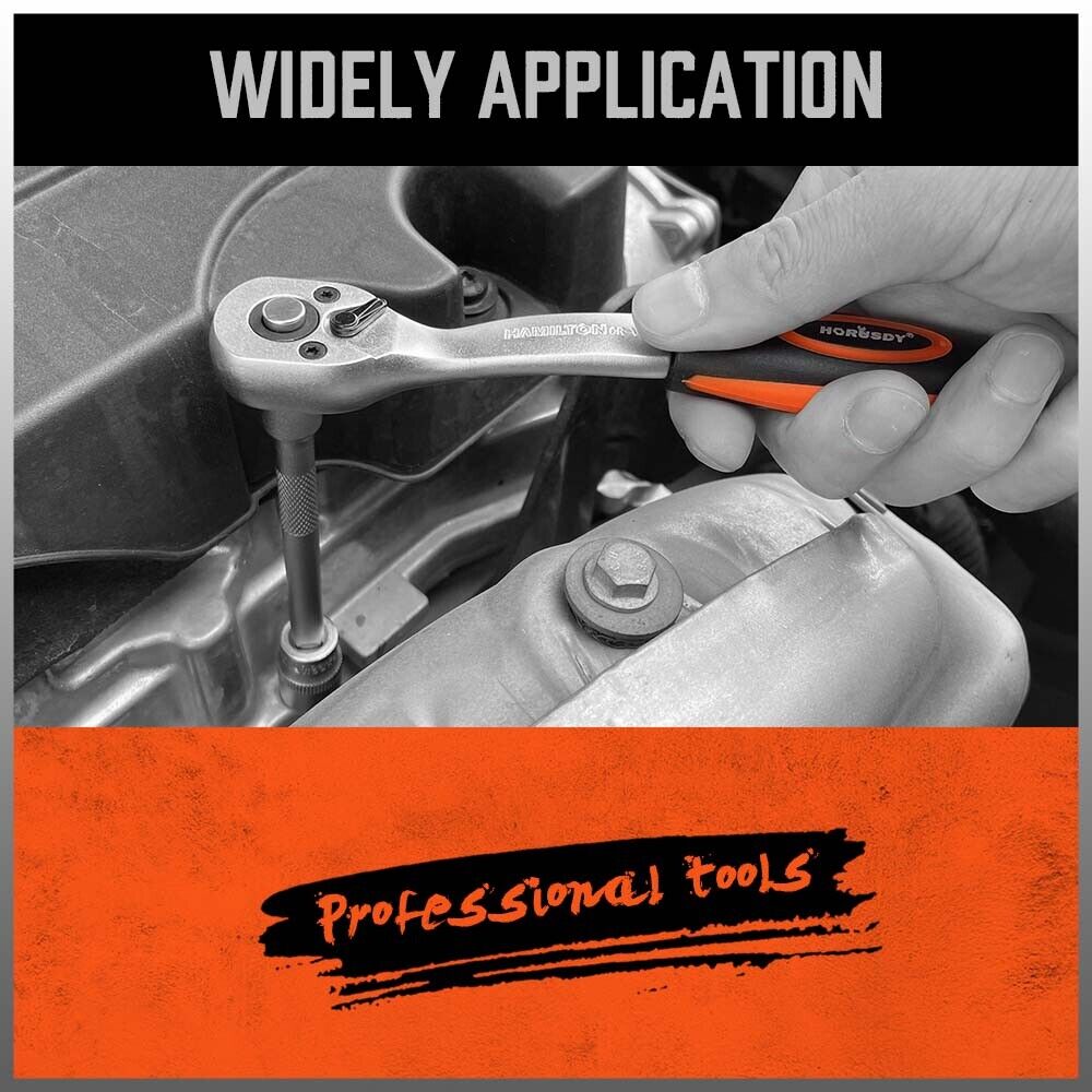 72-TOOTH RATCHET – Smooth ratcheting mechanism with quick release button and reversible switch, designed for efficient work in tight or awkward spaces.