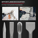 MULTI-FUNCTION USE – Channelling, edging, breaking and penetrating chisels handle demolition, renovation and precise excavation tasks.