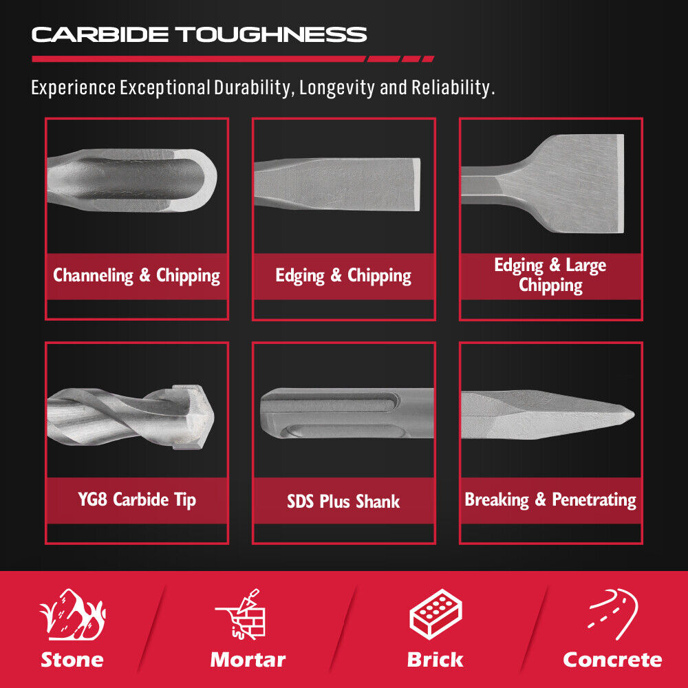 CARBIDE DURABILITY – YG8C carbide tips ensure strength, hardness and long-lasting performance when drilling or chiselling tough materials.