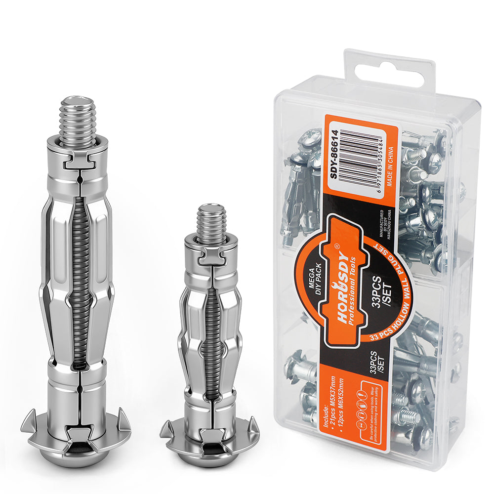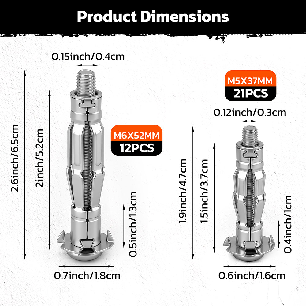 Includes 21 pcs M5 × 37 mm and 12 pcs M6 × 52 mm metal hollow wall anchors, designed to cover common fixing needs for light to medium-duty home and workshop installations.