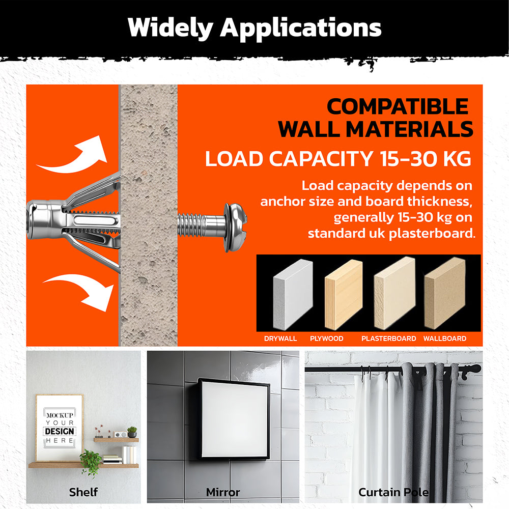 Engineered for use in drywall, plasterboard, wallboard, and plywood, making it ideal for shelves, mirrors, curtain poles, cabinets, and decorative fixtures.