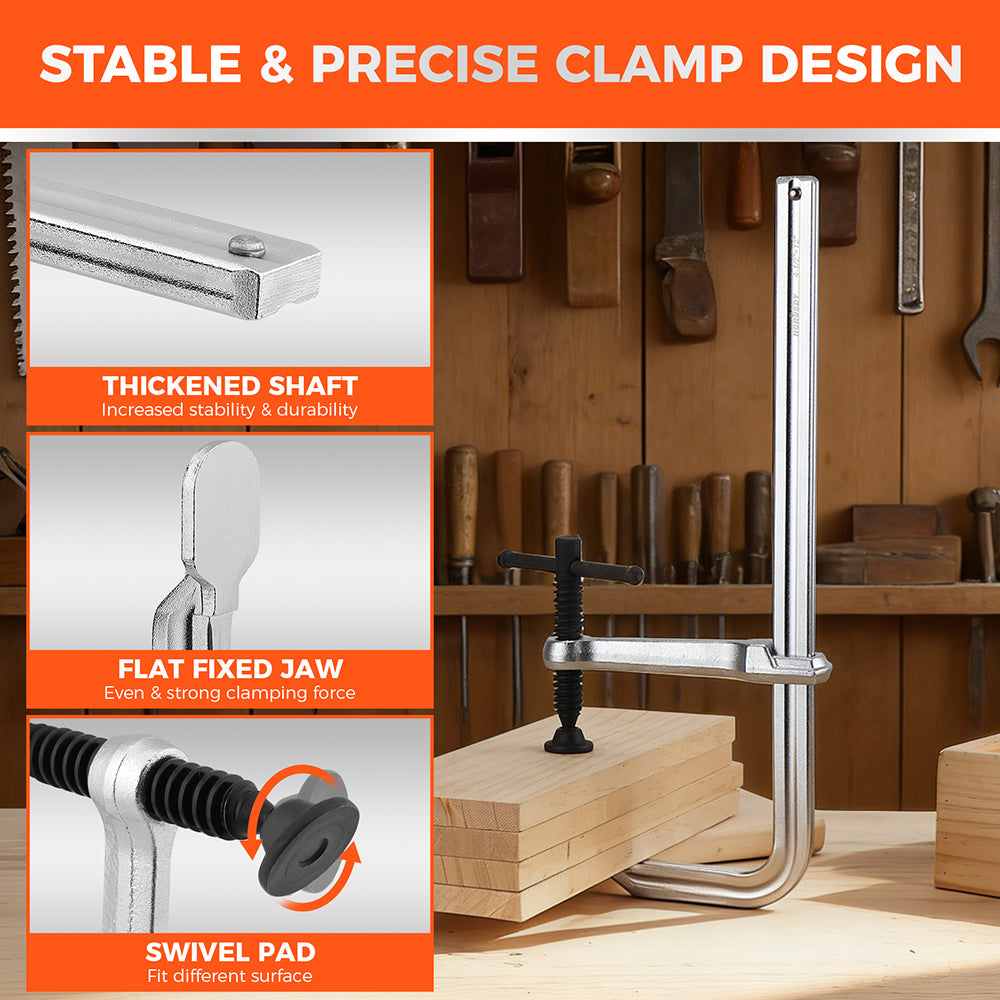 Extra-wide 13" max jaw opening and 4.7" throat depth allow secure clamping of thick timber, steel sections, panels, and frames.