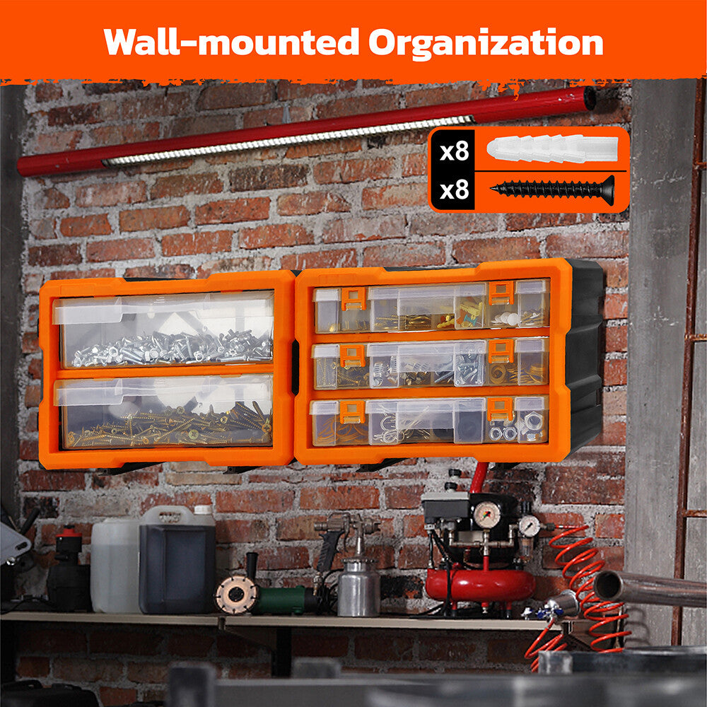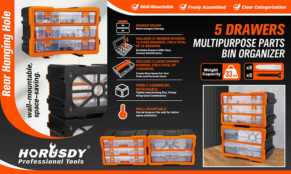 HORUSDY 5-Drawer Multipurpose Parts Bin Organizer - Modular, Stackable, Wall-Mountable with Removable Dividers | 33lb Capacity