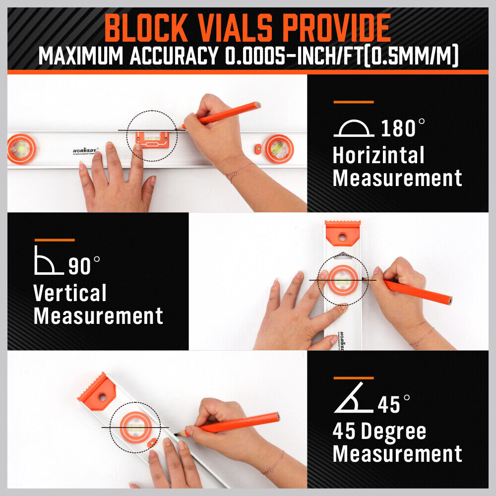 3 Measurement Angles – Includes horizontal (180°), vertical (90°), and 45° vials for versatile leveling accuracy.
