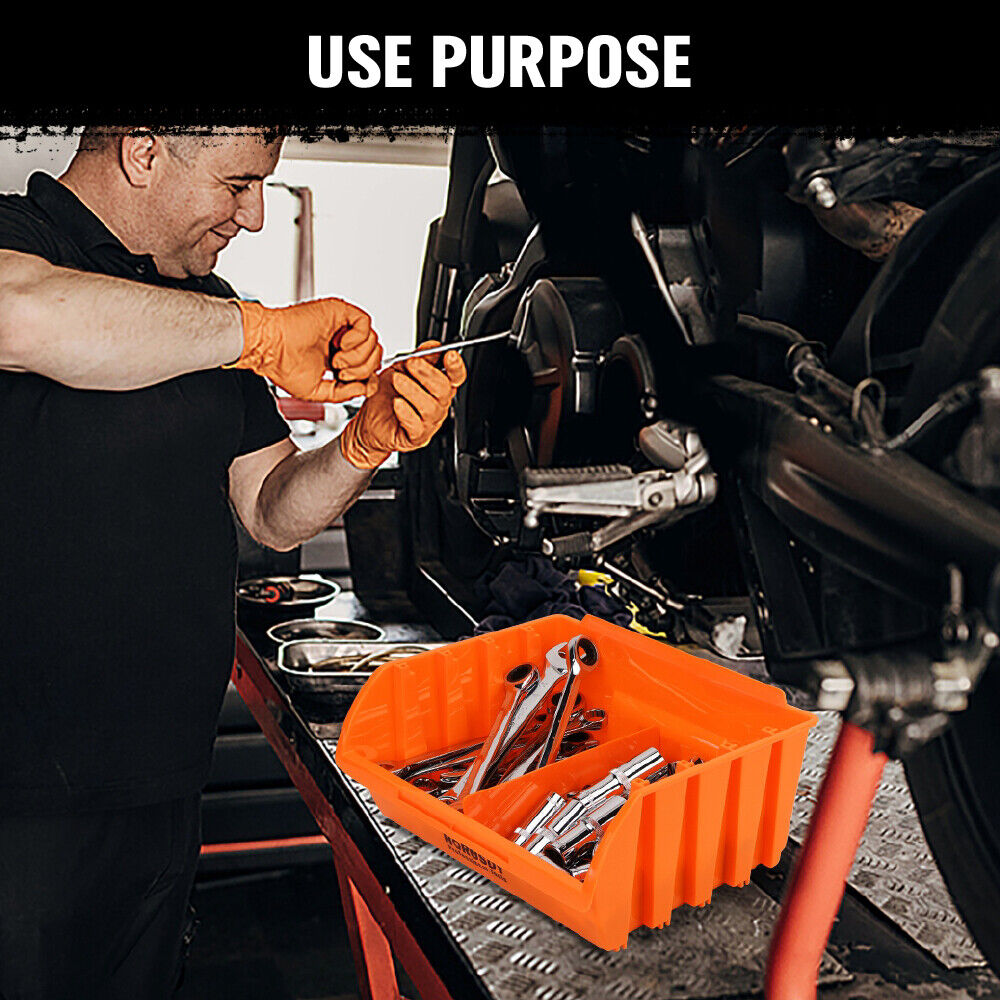 Includes six large stackable storage bins with dividers, ideal for organising tools, screws, craft supplies, toys, stationery, and small parts in garages, workshops, classrooms, and offices.
