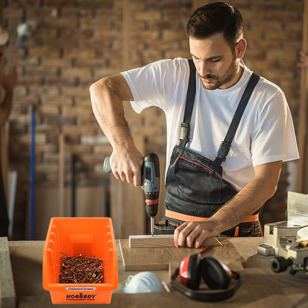 Includes six compact stackable storage bins designed for organising screws, bolts, small tools, craft items, toys, stationery, and other small parts in homes, garages, and workshops.