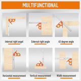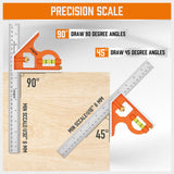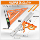 Precision Marking – Features metric and imperial graduations, spirit levels, and pivot points for accurate 45°, 90°, and 180° angle measurements.