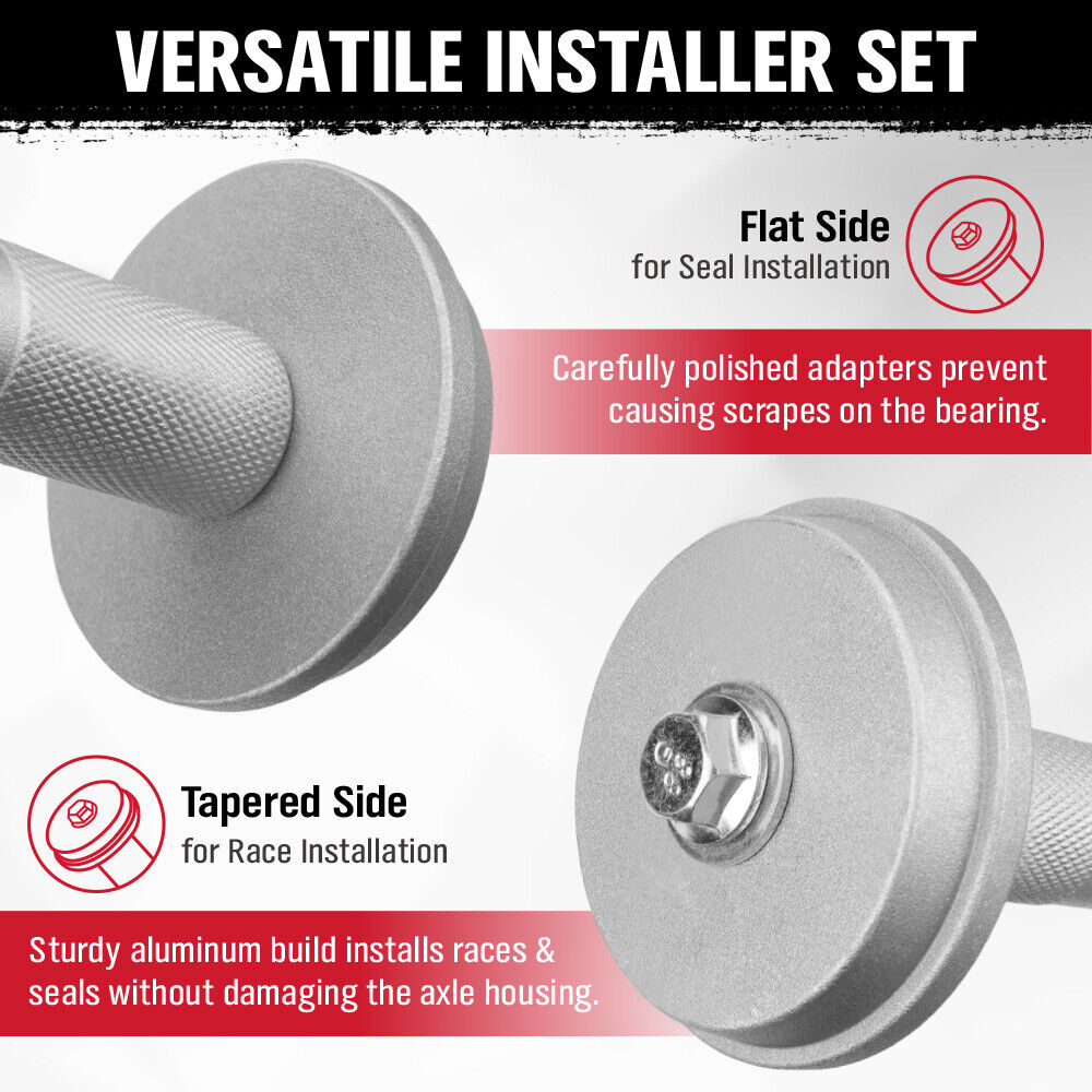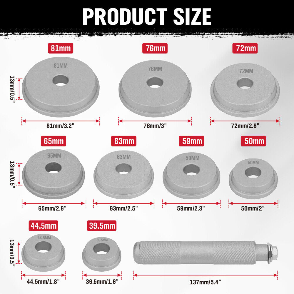 10-PIECE COMPLETE KIT – Includes driver handle and 9 collars (39.5mm to 81mm) for installing most standard wheel bearing races and seals without damage.