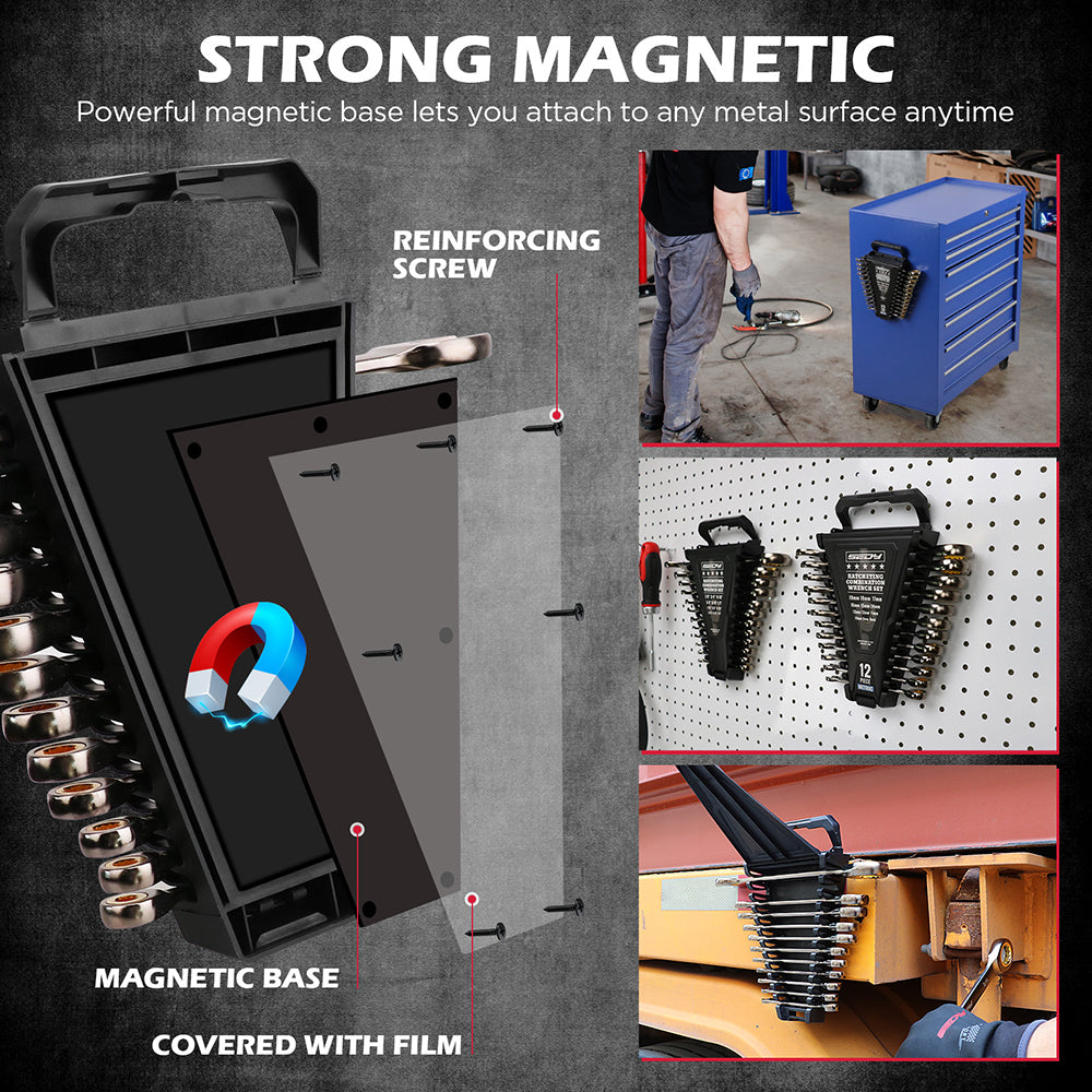 Two strong magnetic trays (one for metric, one for SAE) mount securely to toolboxes, metal cabinets or pegboards.